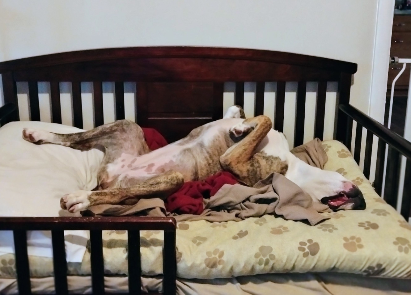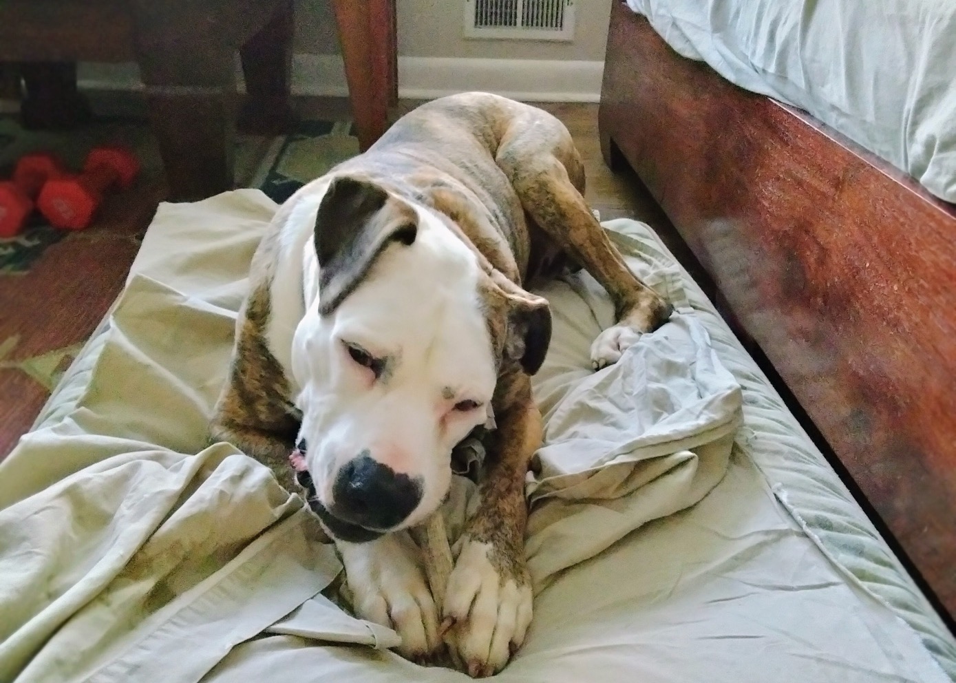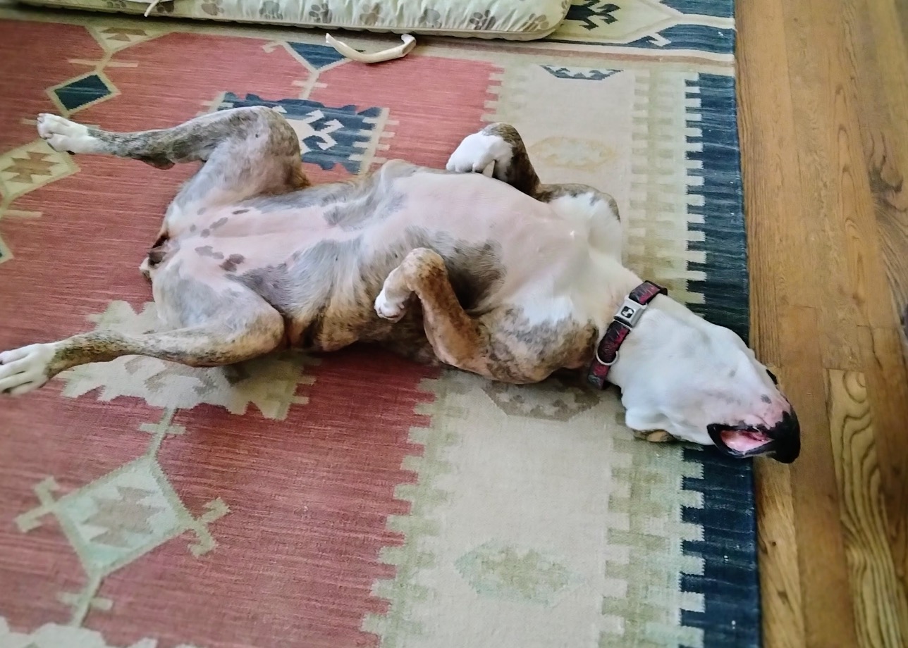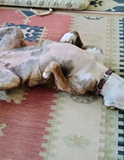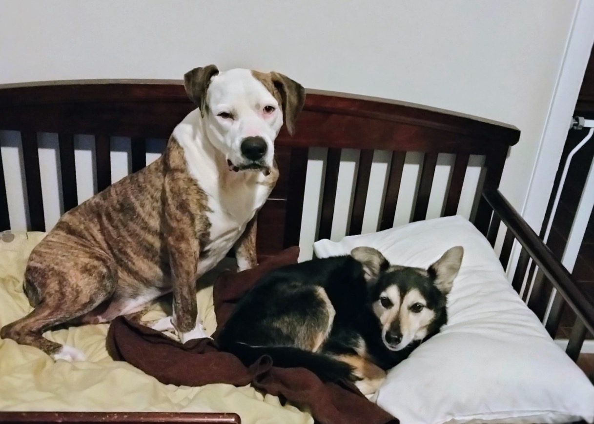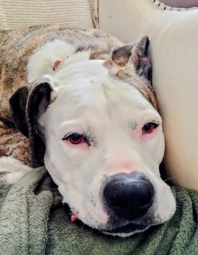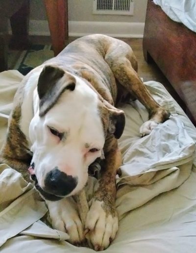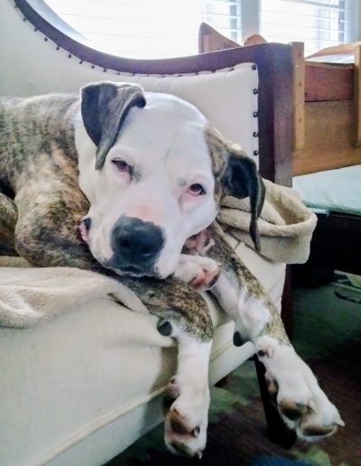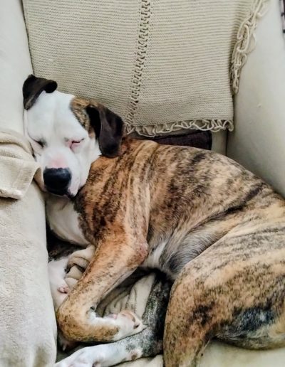 Penelope is a 75-pound Pitbull-Boxer mix with a face that tells a story. She spends most of her days perfecting the art of the low-energy snooze. Between her drooping left cheek—which gives her a permanent look of charming skepticism—and her habit of twisting her body into pretzel shapes, she is a local icon of relaxation.