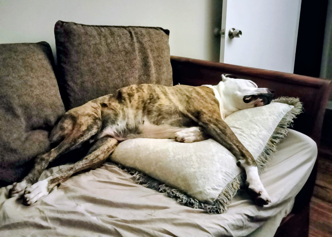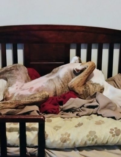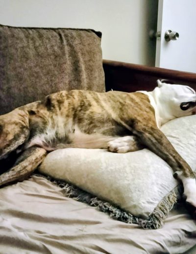 Once she trusts a fellow canine, the “Old Lady” facade slips. She’ll suddenly let out a single “woof” and zoom past a friend, or playfully paw at them before collapsing back into her pretzel shape for a three-hour nap. Penelope might look aloof at first glance, but to those who know her, she is a 75-pound heart wrapped in beautiful brindle fur and quiet loyalty.