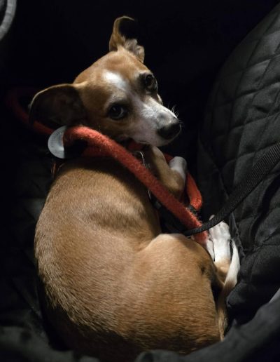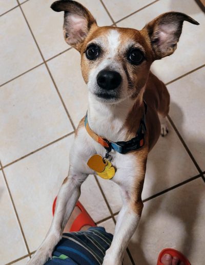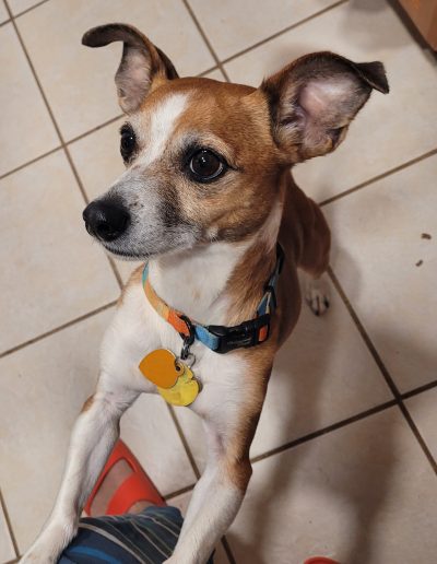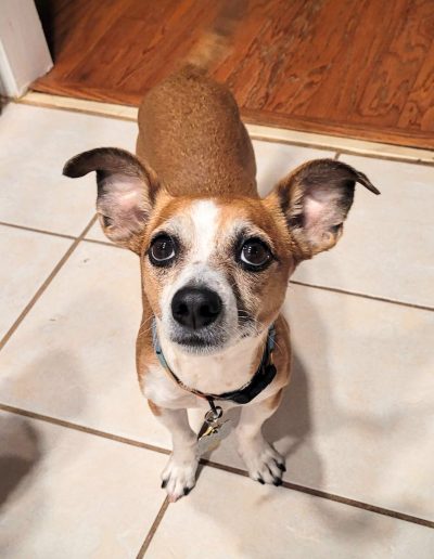 Wulfrik is a 6 year old 17lb Chaweenie who is on the more submissive side with other dogs after structured introductions. He is housebroken and signals potty time by sitting by the door (so cute!) and is excellent in the crate. He goes in the crate on his own and is perfectly content in there, snuggling up in his bed with a blanket. He also knows the command “sit!”