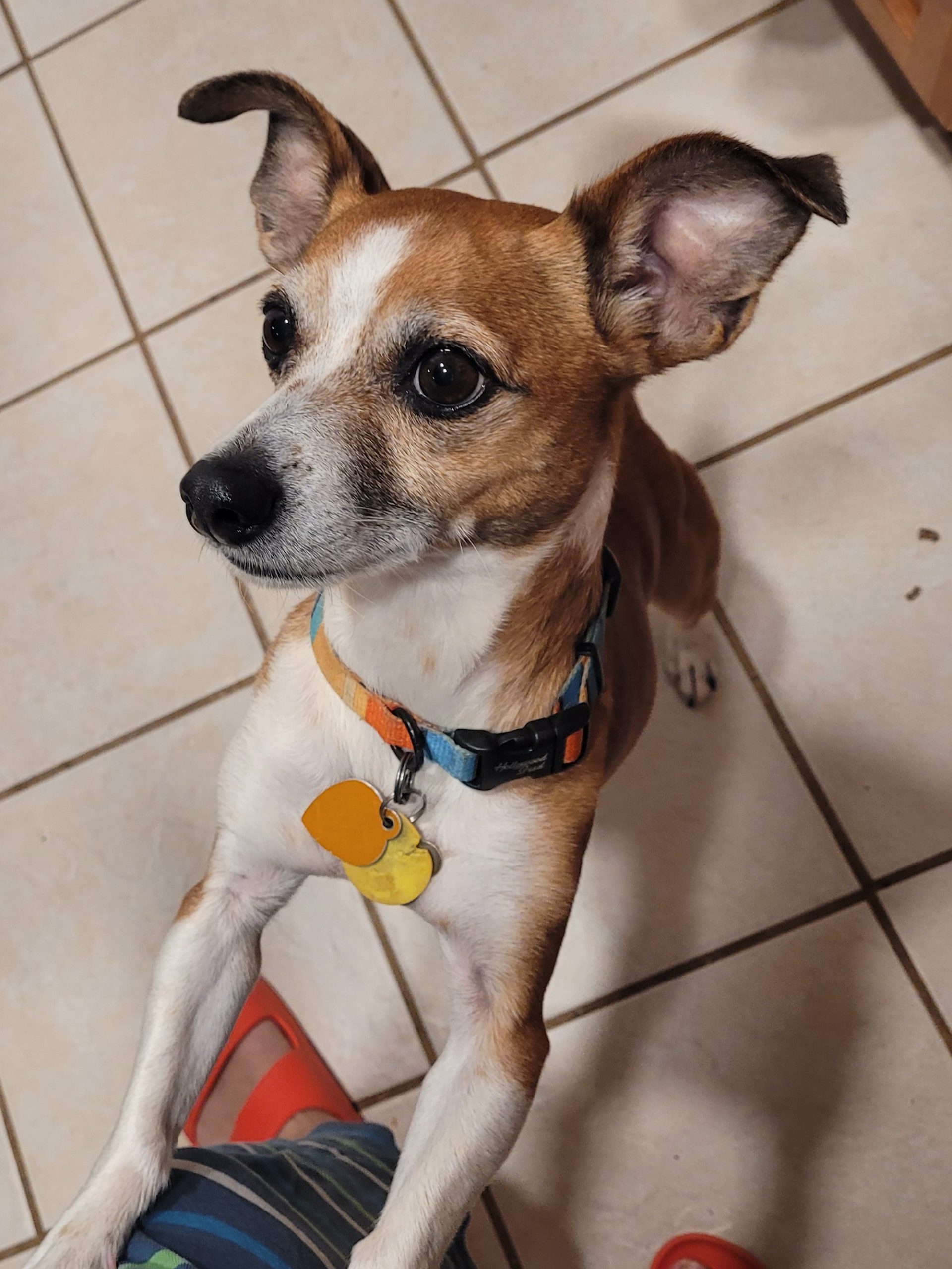 Wulfrik is a 6 year old 17lb Chaweenie who is on the more submissive side with other dogs after structured introductions. He is housebroken and signals potty time by sitting by the door (so cute!) and is excellent in the crate. He goes in the crate on his own and is perfectly content in there, snuggling up in his bed with a blanket. He also knows the command “sit!”